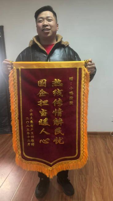 市民王先生通过12345热线反映山水大集经营摊位紧缺问题,集团接到转办后迅速响应,安排专人跟进,持续关注摊位动态,并在出现空位时立即联系王先生,协助其落实摊位,顺利开启经营之路。事后,王先生专程送来锦旗和感谢信,锦旗上“国企担当暖人心,热诚传情解民忧”的字样,正是对这份贴心服务的最佳褒奖。